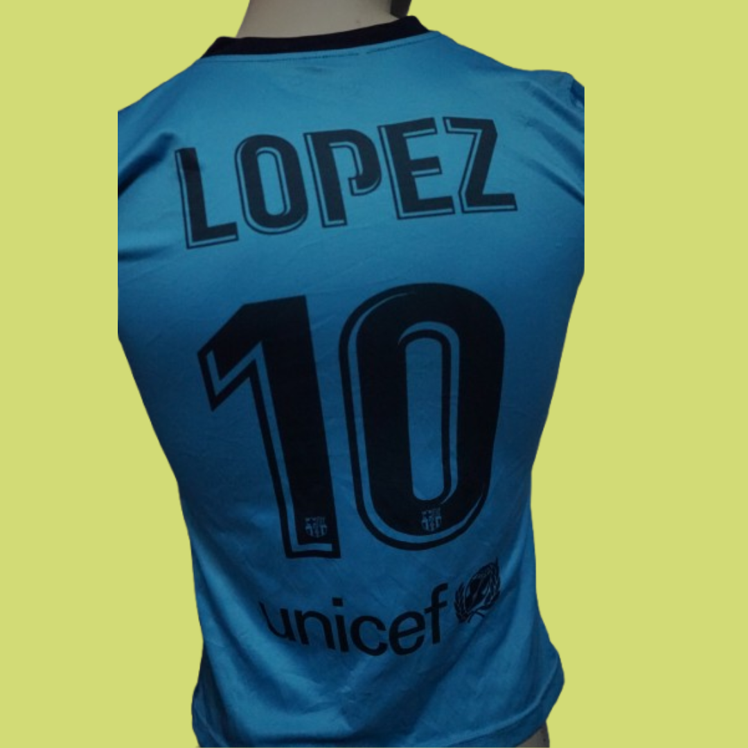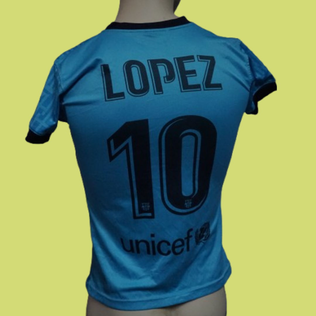 Personalização nas costas com o nome “Lopez” e o número 10, com detalhes do logótipo do Barça no interior dos algarismos;